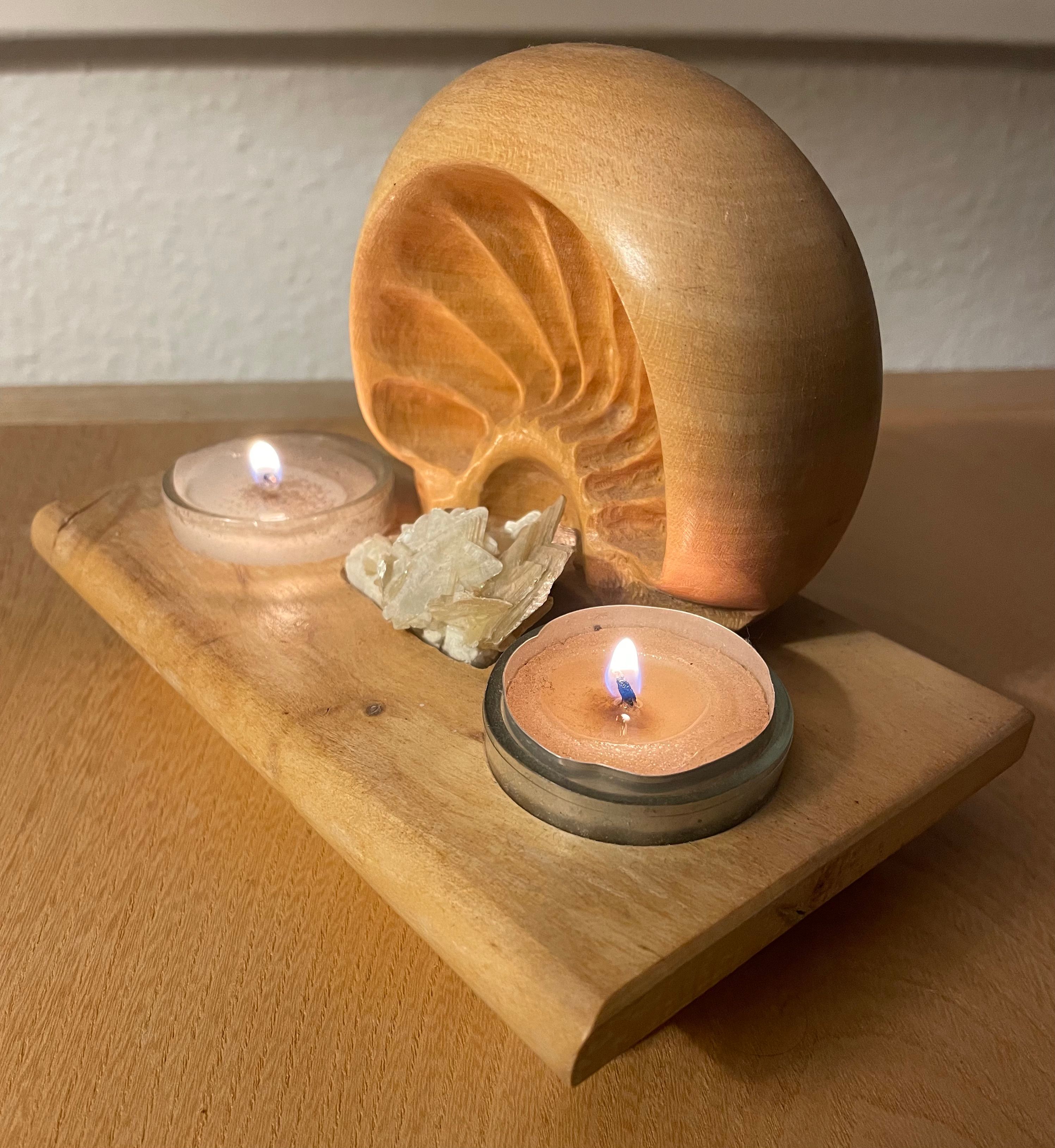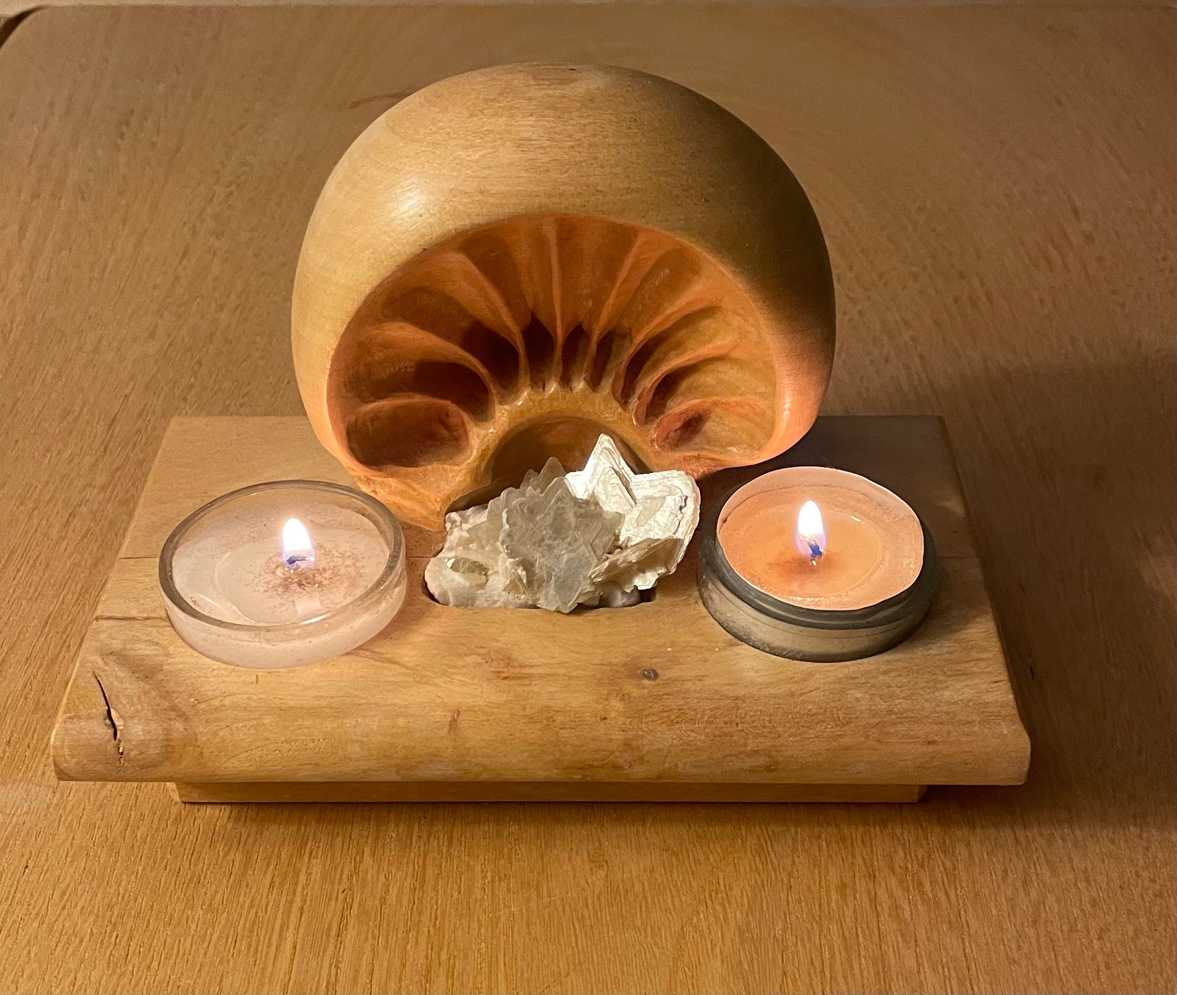 Ahornholz strahlenförmig beschnitzt, Edelstein:Moskovit, eingelassene Glas-Teelichthalter